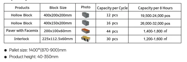 A berendezés az üreges téglatermékek széles választékát állítja elő, amelyek többféle funkcionális típust is lefednek, mint például a közönséges blokkok, dekoratív blokkok és szigetelőblokkok. A furatformák közé tartoznak a négyzetes és kerek furatok, az elrendezéssel pedig egysoros, kétsoros és többsoros furatszerkezeteket lehet elérni. Az öntőforma cseréjével vagy a berendezés paramétereinek beállításával a különböző típusú téglatermékek rugalmasan válthatók a változatos piaci igények kielégítésére.