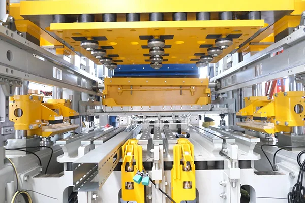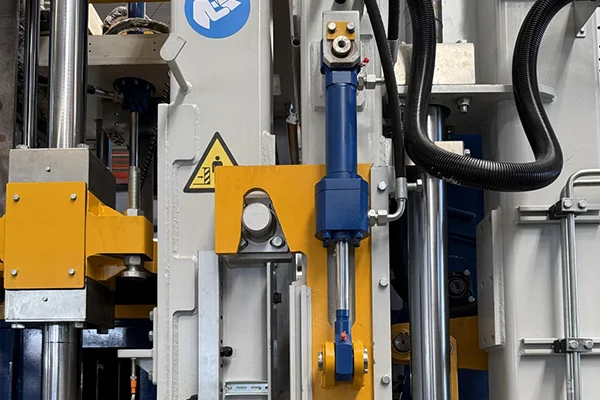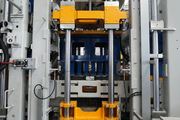 7Nyomja meg a Fejrögzítő eszközt Ez a mechanikus reteszelőmechanizmus nagy szilárdságú reteszelőblokkokból, ék alakú présfejből és kettős működésű hidraulikus hengerekből áll. A kiszerelés során a hengerek meghajtják a reteszelőblokkokat, hogy sugárirányban rögzítsék a présfejet, mechanikus holtpontot képezve. Ezután a formát állandó nyomás alatt kiengedik, hatékonyan kiküszöbölve a rugalmas visszapattanást és a mikromozgást – biztosítva az éles téglaéleket, a sima felületeket és a jelentősen jobb termékminősítési arányt.